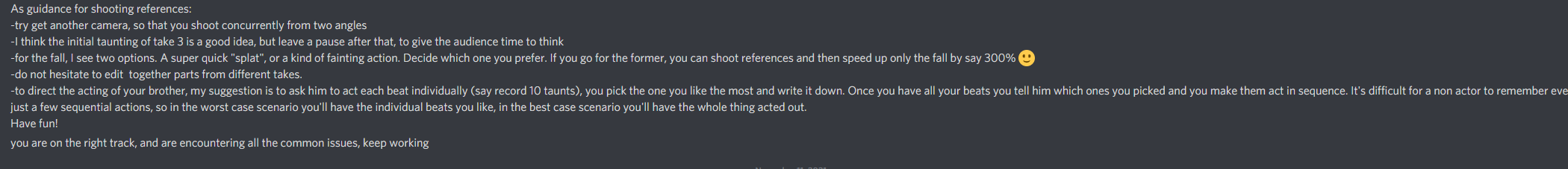 Editing and stabilization of the footage was all carried out in DaVinci Resolve 17. This was different from the previous module’s method of stabilizing and exporting each clip separately in After Effects, then using Premiere Pro to combine the clips into a single video. I found DaVinci Resolve to be a much more efficient way to work with reference video due to the fact that clips can be isolated and stabilized in the same software that places them in a larger timeline. A similarity between this module and the last, however, was my use of the Epic Pen application to match the position of the actor between clips by marking positions of the head and feet on the screen.